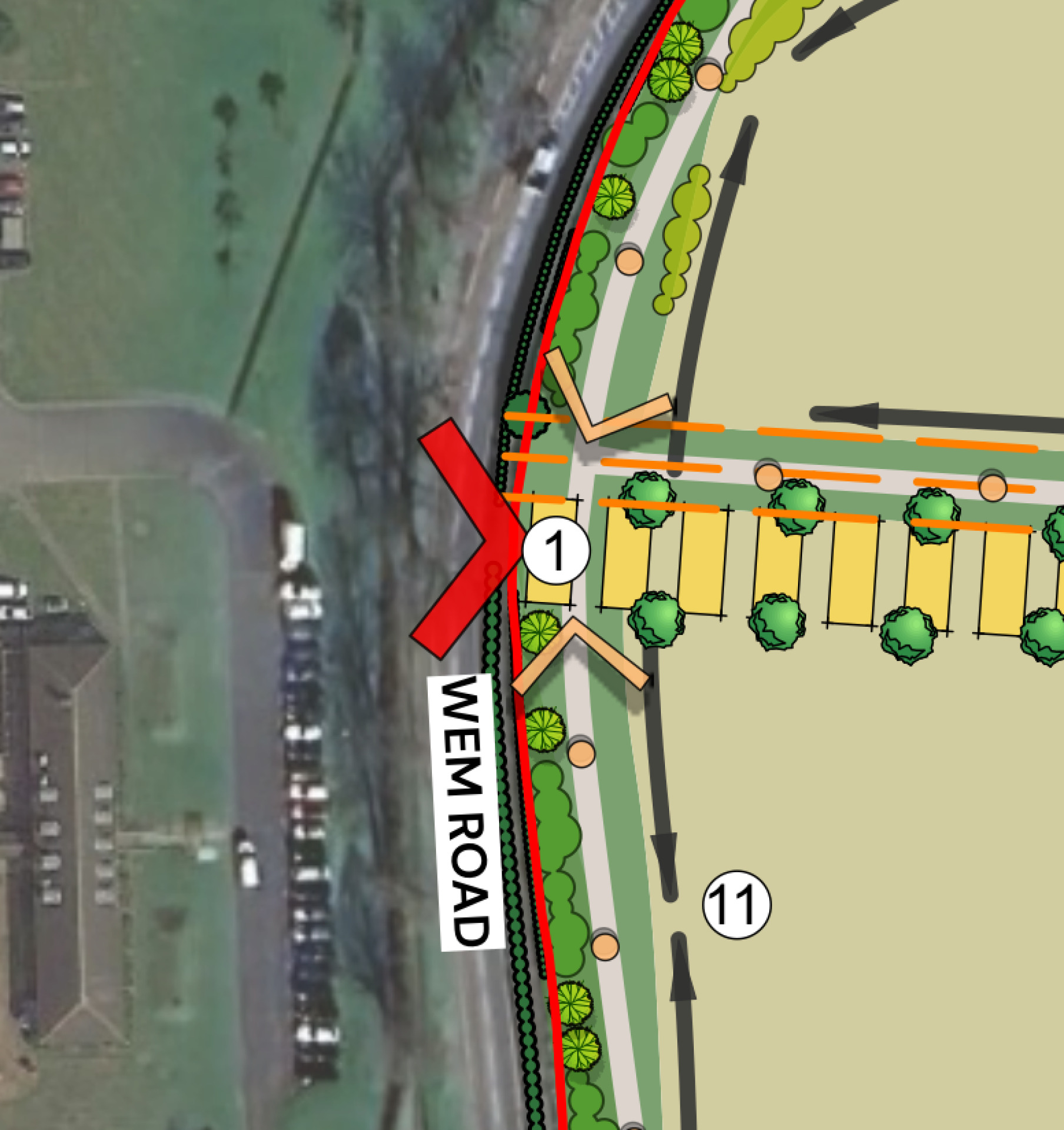 Vehicular, cycle and pedestrian access will be taken via a new junction with Wem Road. Click to enlarge.